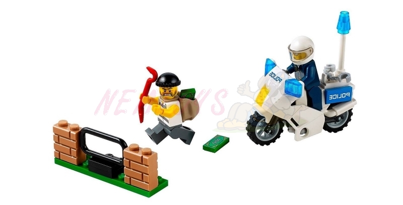 Zloděj prchá s ukradenými penězi! Vydej se za ním s policistou na super policejní motorce a nasaď mu pouta dřív, než přeskočí přes plot a zmizí s pytlem naplněným uloupenou kořistí. Obsahuje minifigurky zloděje a policisty s různými doplňky.