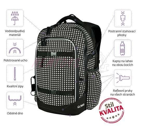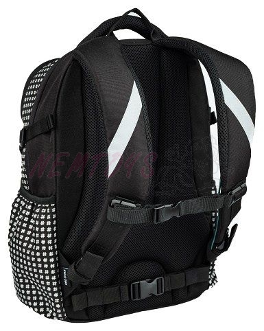 Kvalitní anatomicky tvarovaný batoh vhodný od 3. třídy, systém Air Flow a prodyšné polstrování,2komory na formát A4 a 3 vnitřní přihrádky,kapsa na notebook,vodoodpudivý materiál,zpevněné nepromokavé dno,reflexní prvky,hrudní pás. nově navíc popruhy na přední kapse pro uchycení např. mikiny na cestu domů ze školy, pod horním popruhem v přední části skrytá kapsička na cennosti